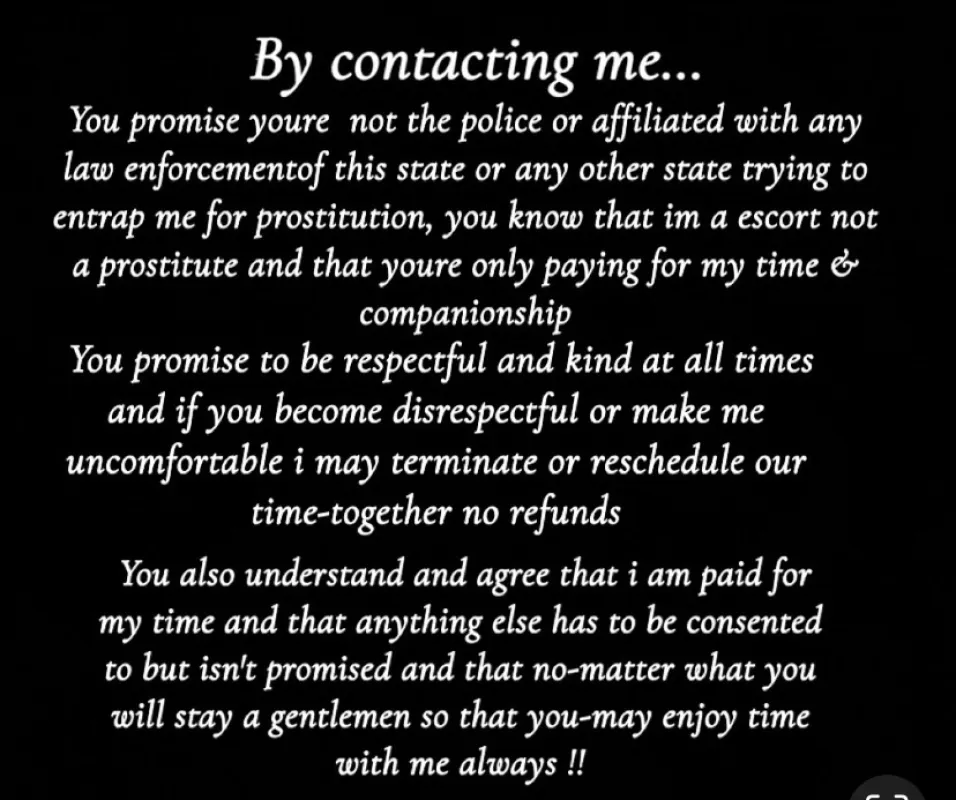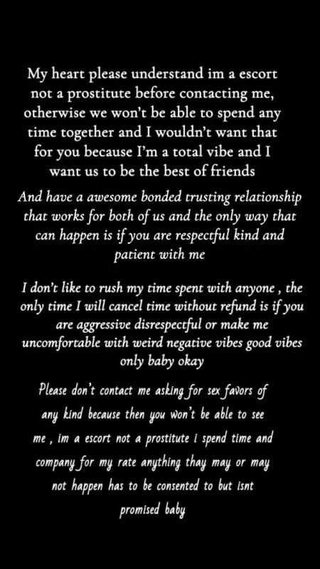 My heart please understand im a escort not a prostitute before contacting me, otherwise we wonβt be able to spend any time together and I wouldnβt want that for you because Iβm a total vibe and I want us to be the best of friendsβ£ And have a awesome bonded trusting relationship that works for both of us and the only way that can happen is if you are respectful kind and patient with me π«ΆπΌβΊ I donβt like to rush my time spent with anyone , the only time I will cancel time without refund is if you are aggressive disrespectful or make me uncomfortable with weird negative vibes - good vibes respect and kindness only baby okay π«ΆπΌ Please donβt contact me asking for sex favors of any kind because then you wonβt be able to see me , im a escort not a prostitute i spend time and company for my rate anything thay may or may not happen has to be consented to but isnt promised baby β£ no car dates - thats for prostitution PLEASE HAVE SNAPCHAT TO VIDEO CHAT VERIFY ESPECIALLY IF YOU WANT TO KNOW WHAT I LOOK LIKE MORE THAN THE DISCRETE OUTFIT PICTURES I POSTED HERE please have a place for me to travel and visit you if you want NO DEPOSIT - house apt hotel my place requires a deposit if we havent spent time before please read disclaimers and rates before contacring me all in pictures holiday rates are going on right now check them out in pictures a see u soon baby the best time spent , sabrina